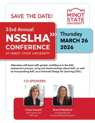 Registration is now open for the 33rd Annual National Student Speech Language Hearing Association conference. The conference will be held on March 26th, 2026, at the Minot State University Campus.